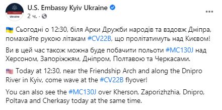 На официальной странице посольства США украинцам предложили помахать рукой самолетам CV22B, когда они будут пролетать. Также самолеты пролетели над Запорожьем, Черкассами, Днепром, Херсоном и Полтавой.