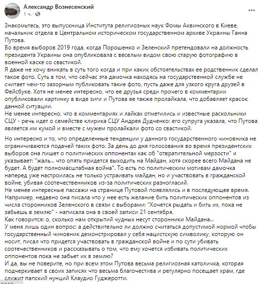 Также Вознесенский опубликовал скриншот ее поста о том, как после выборов она написала, что жаль наблюдать откат и что скоро нужно будет входить на Майдан, хотя "скорее всего Майдана не будет, а будет полноценная война и скоро".