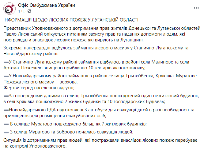 В офисе омбудсмена Украины также приводят отдельные данные по сгоревшим домам. В селе Кряковка повреждены два жилых дома и десять хозпостроек, в Муратовом - более семи жилых домов. Оттуда, а также из села Боброво началась эвакуация людей.