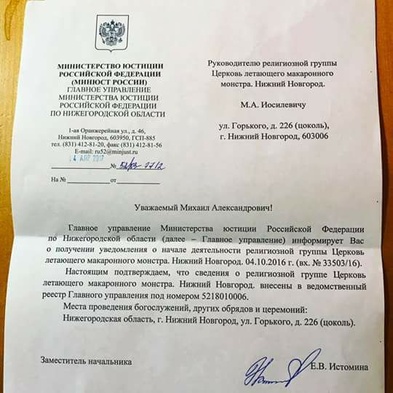 Интересно, что Иосилевич по совместительству является главой нижегородского отделения "Церкви летающего макаронного монстра" - это международная квазицерковная организация, которая в России пародирует и высмеивает РПЦ. Но имеет официальный статус церкви.