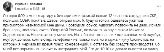 "Сегодня 6:00 в мою квартиру с бензорезом и фомкой вошли 12 человек: сотрудники СКР, полиции, СОБР, понятые. Дверь открыл муж. Я, будучи голой, одевалась уже под присмотром незнакомой мне дамы. Проводили обыск. Адвокату позвонить не дали. Искали брошюры, листовки, счета "Открытой России", возможно, икону с ликом Михаила Ходорковского. Ничего этого у меня нет. Но забрали, что нашли - все флешки, мой ноутбук, ноутбук дочери, компьютер, телефоны - не только мой, но и мужа, - кучу блокнотов, на которых я черкала во время пресс-конференций. Я осталась без средств производства", - сообщила Славина.