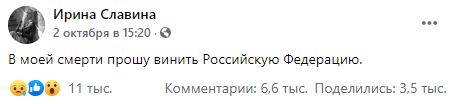 Уже второго октября Ирина написал свой последний пост: "В моей смерти прошу винить Российскую Федерацию".