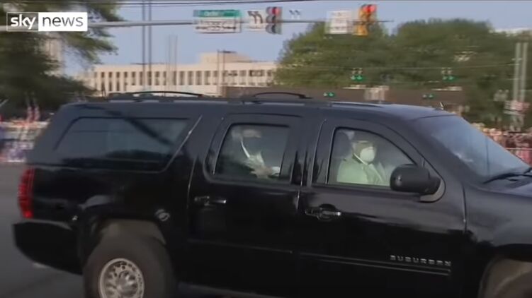 Кортеж Дональда Трампа проехал мимо толпы сторонников, в одном из полностью закрытых авто сидел сам президент. Он был в черной медицинской маске и помахал рукой из окна собравшимся людям. Окна бронированного автомобиля были закрыты. На всех находящихся в машине так же были маски.