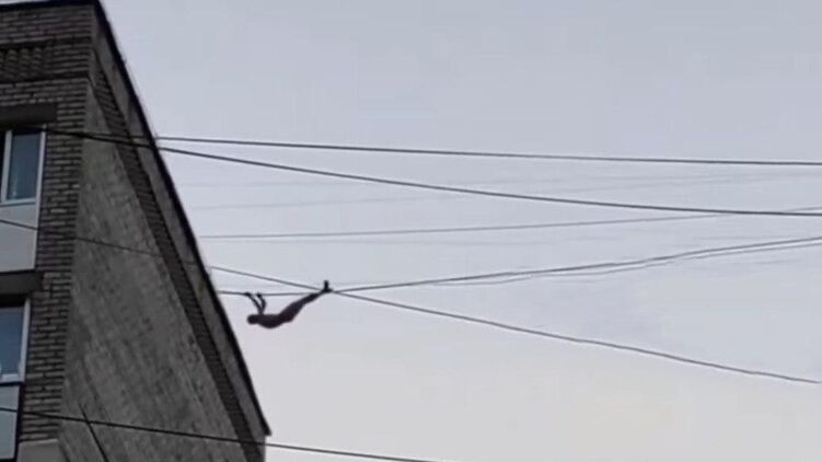 Мужчина перелез с одного дома к другому по проводу несколько раз. Кадр с видео
