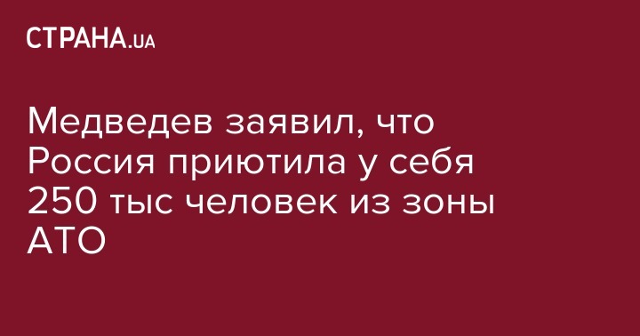 Премьер-министр Российской Федерации Дмитрий Медведев заявил, что из Украины в Россию переселились более 250 тыс. россиян из зоны АТО на Донбассе только с начала 2016 года. Об этом сообщает пресс-служба правительства России.