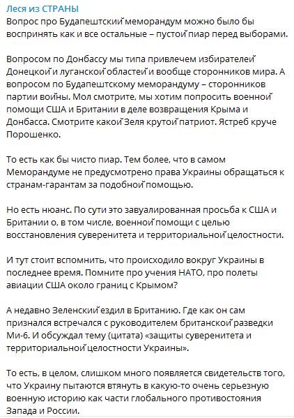 "В целом же все сходятся во мнении, что опрос Зеленского затевается ради последнего пункта, про Будапештский меморандум. Сформулировано оно фиг пойми как, но ясно, что это про США и Великобританию как гарантов территориальной целостности.