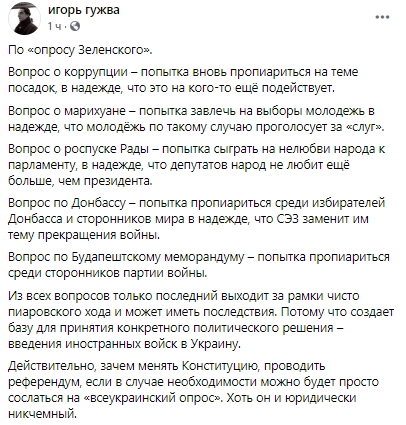 Смысл опроса, который хочет провести Зеленский, комментирует главный редактор "Страны" Игорь Гужва на своей странице в ФБ.