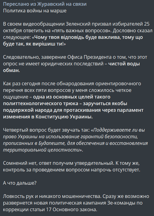 Экс-нардеп Виталий Журавский в своем посте под названием "Политика войны на марше" разбирает возможные последствия всего опроса Зеленского.