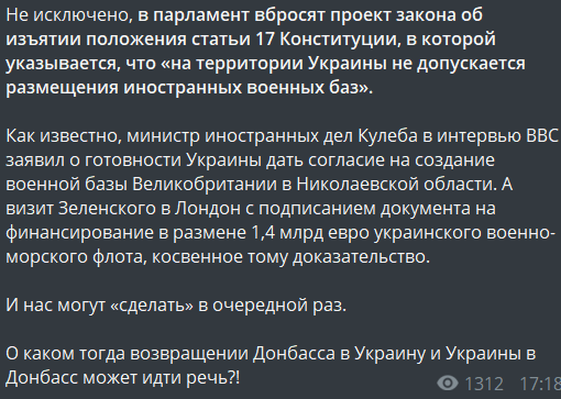 Как известно, министр иностранных дел Кулеба в интервью ВВС заявил о готовности Украины дать согласие на создание военной базы Великобритании в Николаевской области. А визит Зеленского в Лондон с подписанием документа на финансирование в размене 1,4 млрд евро украинского военно-морского флота - косвенное тому доказательство.
