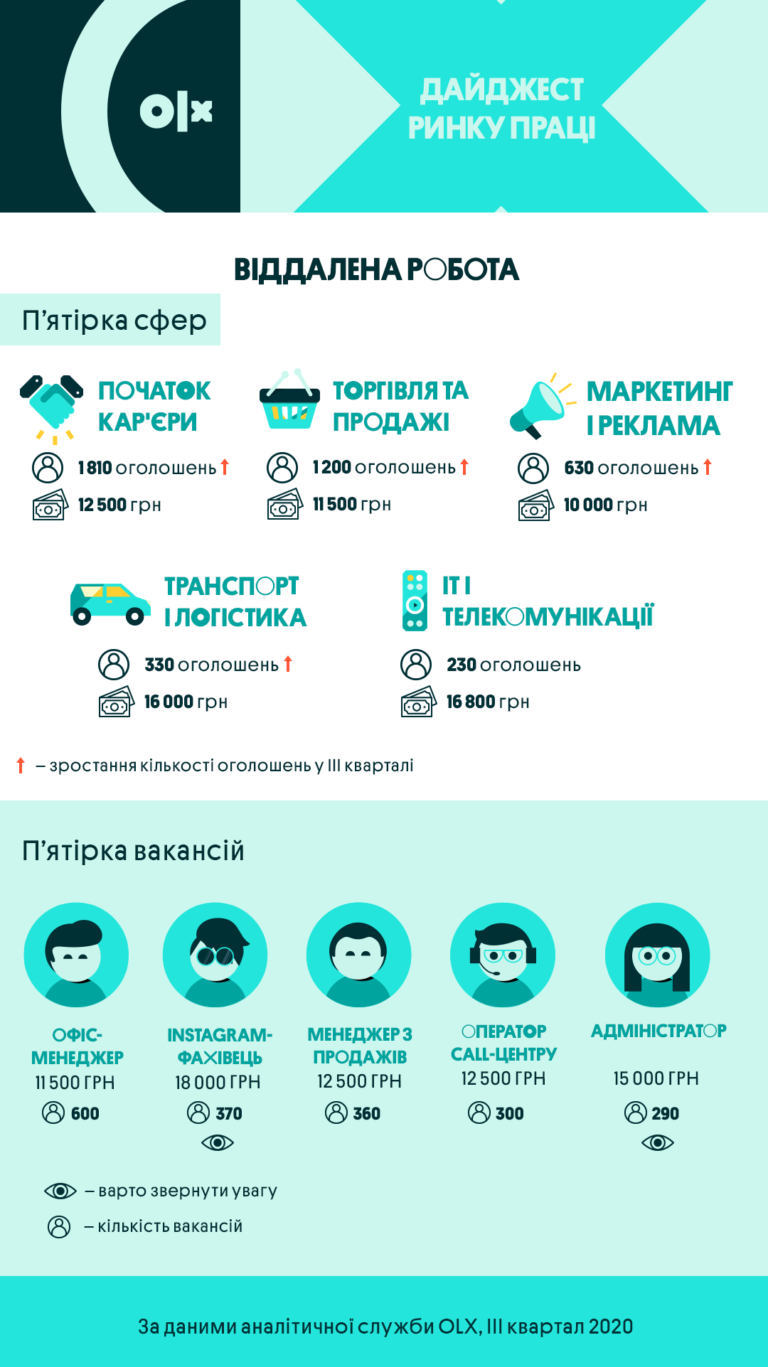 Второе место по количеству вакансий для дистанционной работы занимает сфера торговли и продаж (1,2 тыс вакансий в третьем квартале, что на 34% больше, чем во втором). Средняя зарплата - 11 500 грн.