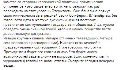 "На подготовку объемного часового интервью для четырех телеканалов, кстати, понадобилось всего часов 8-10 (от появления идеи до ее технической реализации). Что говорит о крутом профессионализме наших телеканалов-мейджоров. Президент отвечает откровенно. Ведет дискуссию, когда не просто ответ/вопрос, а жесткие уточнения журналистов, едкие ремарки. Это и близко не постановочное шоу. И потому что ВА готов к любому поворота разговора. И потому что собрав журналистов за несколько минут до начала, единственное, что я им сказал: "зададите любые вопросы и сами будете модерировать встречу... терзайте - у вас на это ровно час")..."