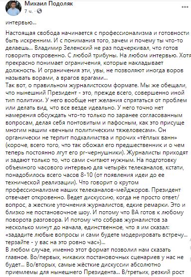 17:30 Медиаконсультант из Офиса президента Михаил Подоляк назвал записанное интервью идеальным журналистским форматом, расхвалил Владимира Зеленского, и описал, что интервью готовили в ускоренном режиме.