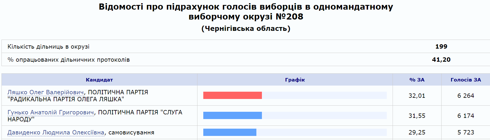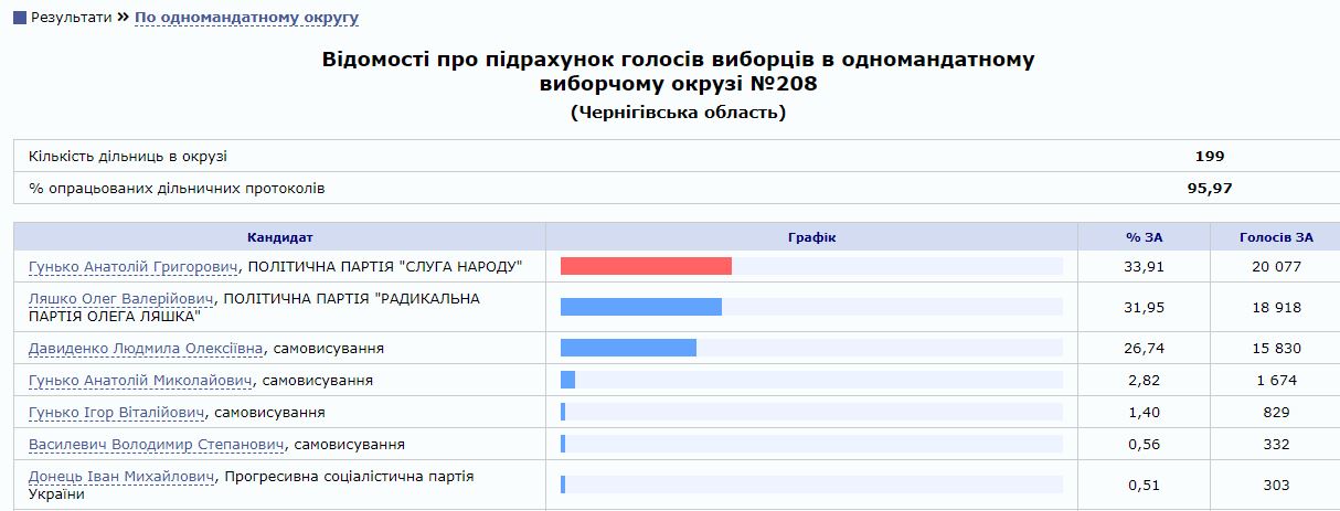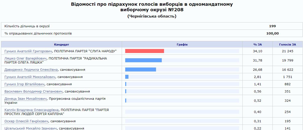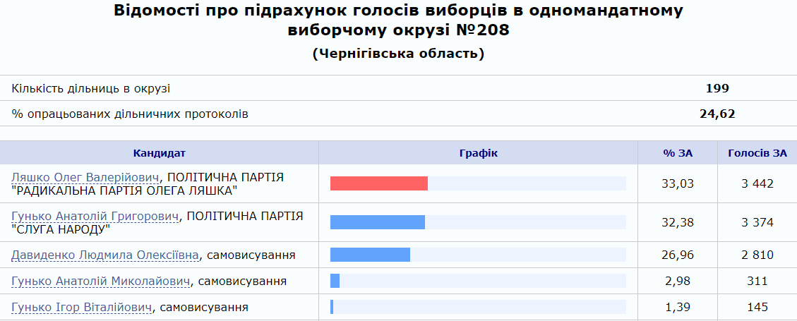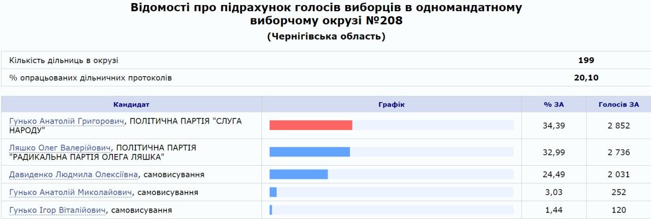 08:49 "Слуга народа" Гунько снова опережает Ляшко на 208 округе Черниговщины с разницей в один процент. Обработано почти 79% бюллетеней.