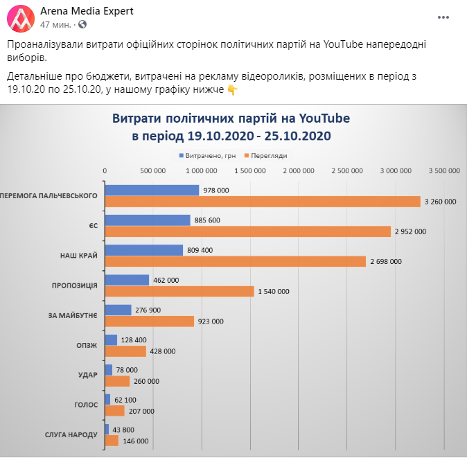 №1 - "Перемога Пальчевского" (почти миллион гривен), второе место у "Европейской солидарности", третье - за "Нашим краем".