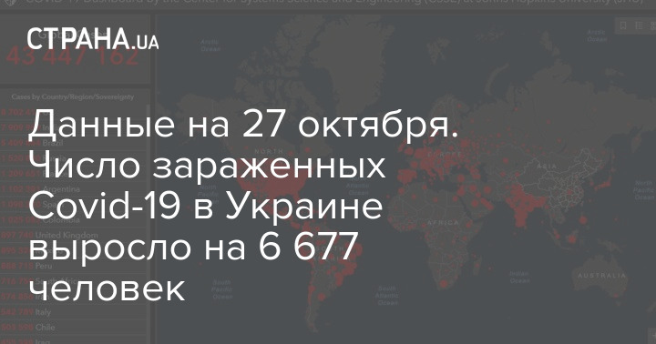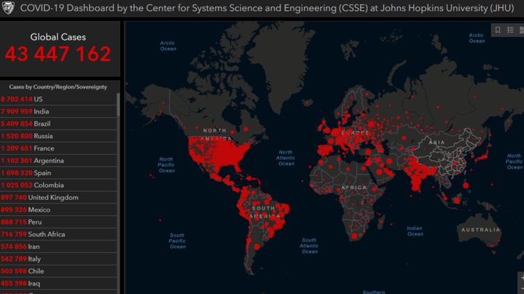 Утром 27 октября число зараженных на планете перевалило за 43 миллиона человек, фото: jhu.edu