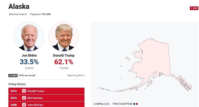 В Аляске (3 выборщика) у Трампа 62,1%, у Байдена - 33,5%. Днем было обработано 50%, с тех пор ничего не изменилось. На прошлых выборах в Аляске поддерживали республиканцев.