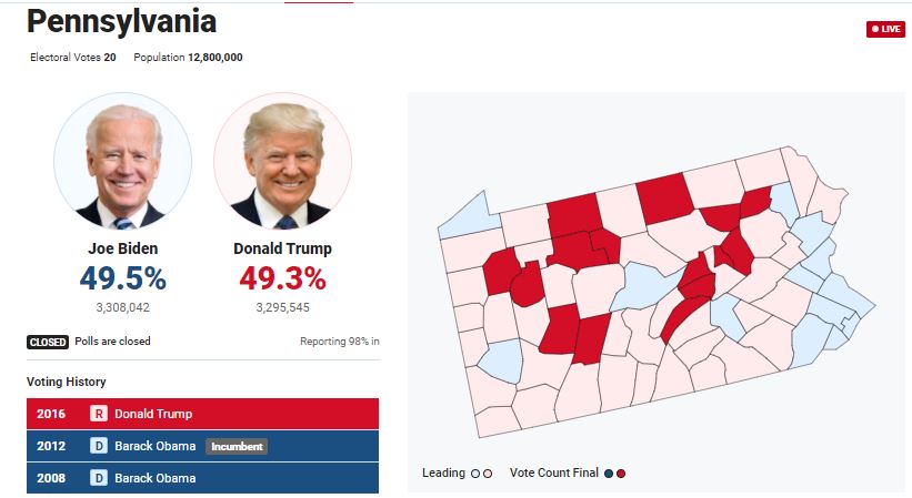 17:12 После странного подсчета в Пенсильвании, когда за день испарилось 2% подсчитанных бюллетеней, у Трампа добавилось 8 135 голосов избирателей, у Байдена - плюс 36 576 голосов.