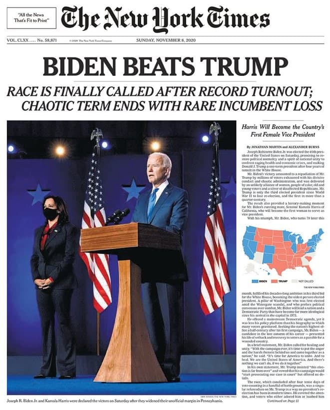 22:09 в Твиттере американской газеты The New York Times уже сообщили, что первая полоса завтрашнего номера будет посвящена победе Байдена над Трампом на президентских выборах.