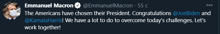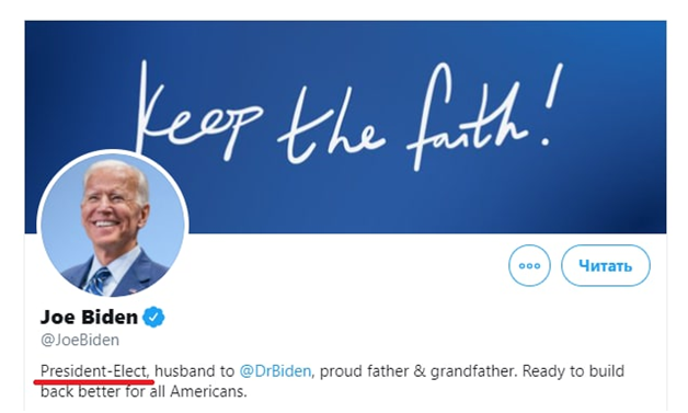 "После завершения кампании пора оставить гнев и резкую риторику позади и объединиться. Пора всей Америке объединиться. И устранить противоречия", - ответил на поздравления Байден.