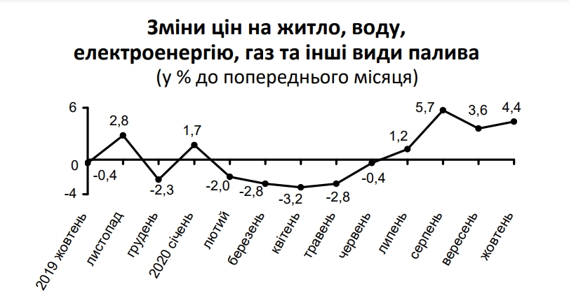 На жилищно-коммунальные услуги цены выросли в октябре на 4,4%, на связанные со здравоохранением - на 0,4%, на образование – на 0,1%.