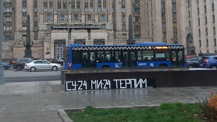 "СУ-24. МИ-24. Терпим...", - написали на плакате под зданием МИД.