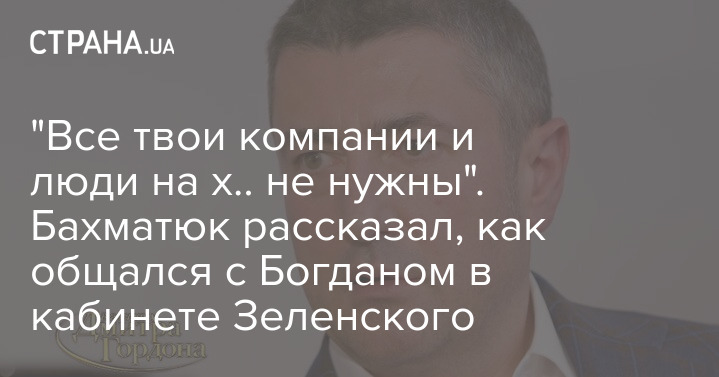 "Богдан опоздал. Я ждал. Я должен был представить свой план, понимание, как я выхожу из ситуации... Зашел Богдан - и с ходу в хамской манере мне заявил... Сказал: "Пошел ты в жопу". Извините. "И все твои компании, и люди на хрен не нужны". Мне пришлось ему ответить. Я сказал: "Уважаемый, не вам это решать". Но я тогда сразу понял, что этот человек настроен на то, чтобы уничтожить мою компанию, не вникая в процесс", - сказал Бахматюк.