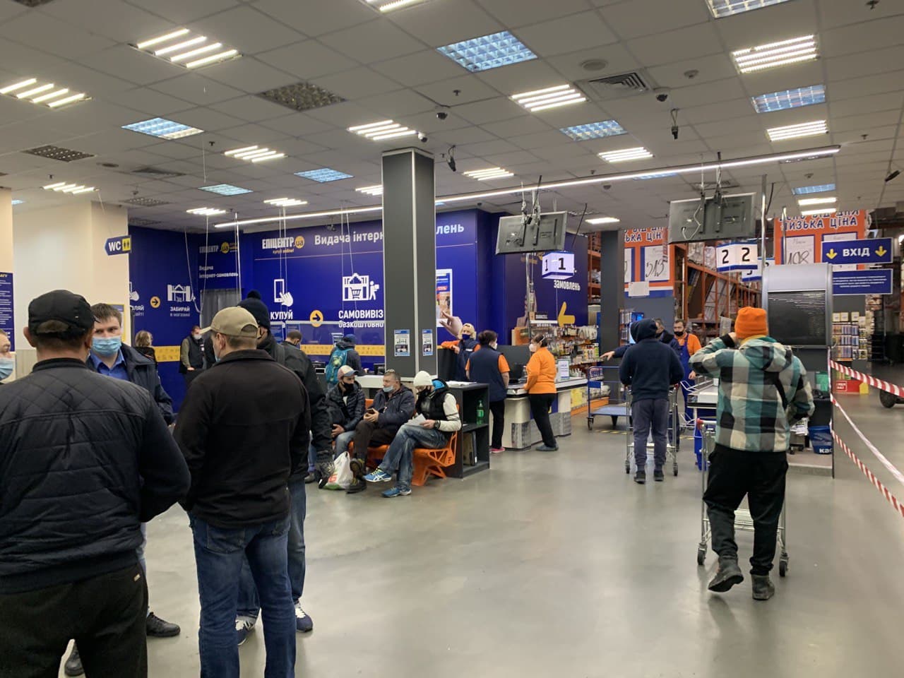 Накануне внимание было приковано к "Эпицентру" - главному нарушителю предыдущего локдауна. Который собирался работать и на этот раз - однако сегодня стало понятно, что в торговые залы людей не впускают. А выдают лишь товары по предварительному заказу на входе, где установили кассу.