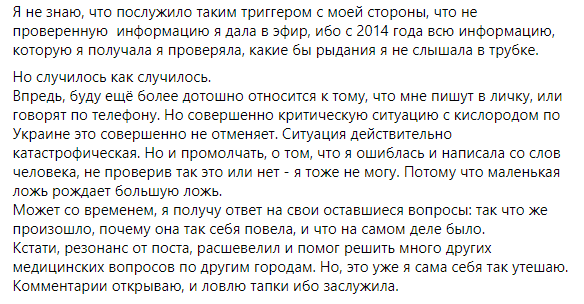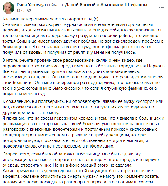 Сама волонтер Дана Яровая признала, что не проверяла информацию, которую опубликовала - мол, она просто поверила женщине, которая ей сообщила якобы о смерти ее мужа после того, как он пожертвовал свой кислород сыну.