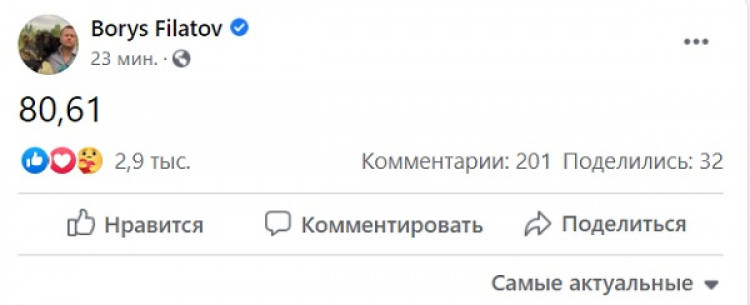 15:07 Мэр Днепра Борис Филатов был переизбран с результатом 80,61%. Об этом он сам сообщил на своей странице в Facebook. В посте Филатов опубликовал только цифры: "80,61".