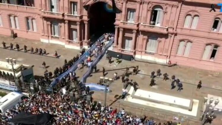На кадрах, которые дает в эфир аргентинский телеканал TN24, видно, как толпа прямо у стен дворца сносит ограждения и вступает в потасовки с полицейскими.