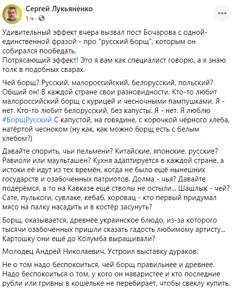 Россияне считают иначе, да и сам Бочаров практически под каждым комментарием оставляет хэштег #БорщРусский.