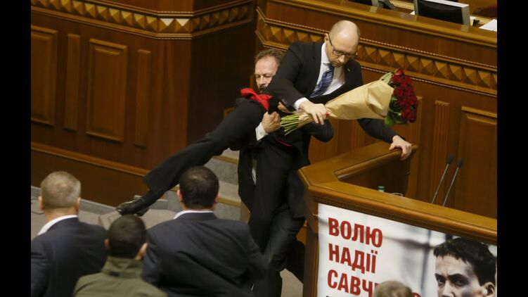 На глазах у изумленных парламентариев он подошел к главе Кабмина, бесцеремонно сунул ему в руки цветы и начал выталкивать с трибуны.