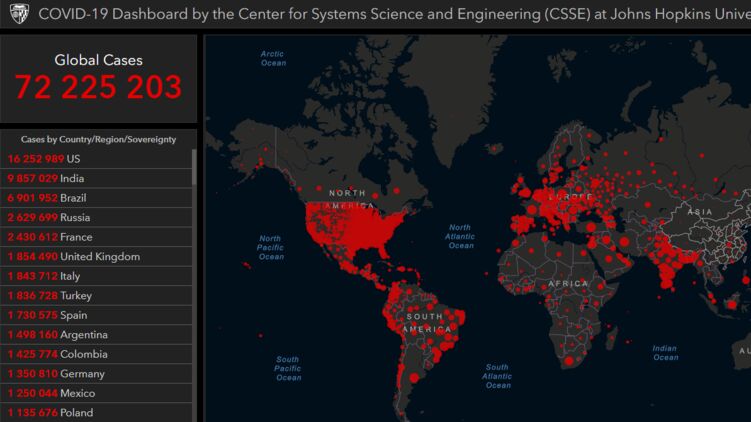 По данным на утро 14 декабря, число зараженных в мире составило уже 72 225 203 человека, фото: arcgis.com