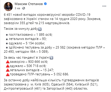 По состоянию на утро понедельника, 14 декабря, количество зараженных коронавирусом в Украине увеличилось на 6 451 человека.