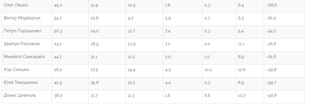 Однако несколько чаще по сравнению с другими политиками доверие выражается Разумкову (ему доверяют 35% опрошенных, однако не доверяют - 52%, баланс доверия- минус 16,9%), мэру Киева Виталию Кличко (соответственно 30% и 59,5%, баланс доверия - минус 29,5%) и Зеленскому (соответственно 30% и 64%, баланс доверия - минус 34%).