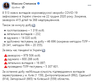 По состоянию на утро вторника, 22 декабря, количество зараженных коронавирусом в Украине увеличилось на 8 513 человек.
