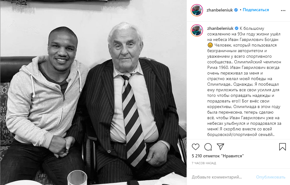 "Человек, который пользовался безграничным авторитетом и уважением у всего спортивного сообщества. Олимпийский чемпион Рима 1960. Иван Гаврилович всегда очень переживал за меня и страстно желал моей победы на Олимпиаде.. Однажды, Я пообещал ему приложить все свои усилия для того чтобы оправдать надежды и порадовать его!", - подписал пост Жан Беленюк.