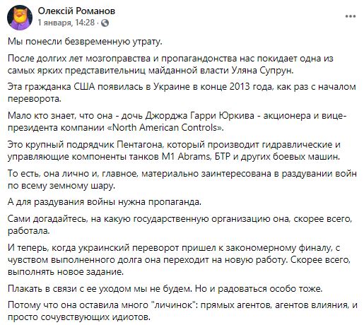 "Мы понесли безвременную утрату. После долгих лет мозгоправства и пропагандонства нас покидает одна из самых ярких представительниц майданной власти Уляна Супрун.