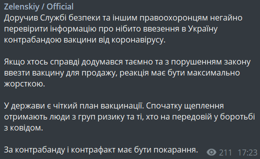 "Поручил Службе безопасности и другим правоохранительным органам немедленно проверить информацию о якобы ввозе в Украину контрабандой вакцины от коронавируса.