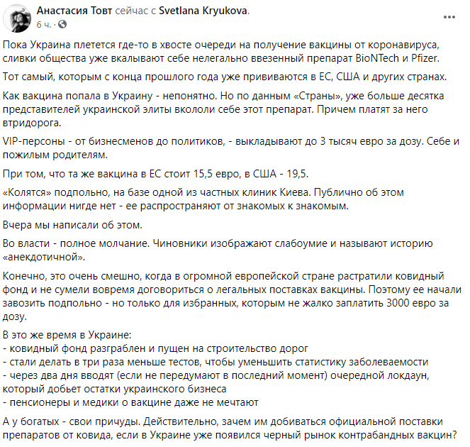 Журналистка "Страны" Анастасия Товт пишет, что вакцинация в Украине началась для избранных.