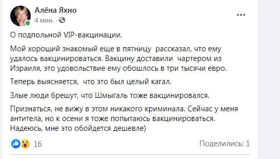 Блогер Алена Яхно подтверждает информацию о подпольной вакцинации.