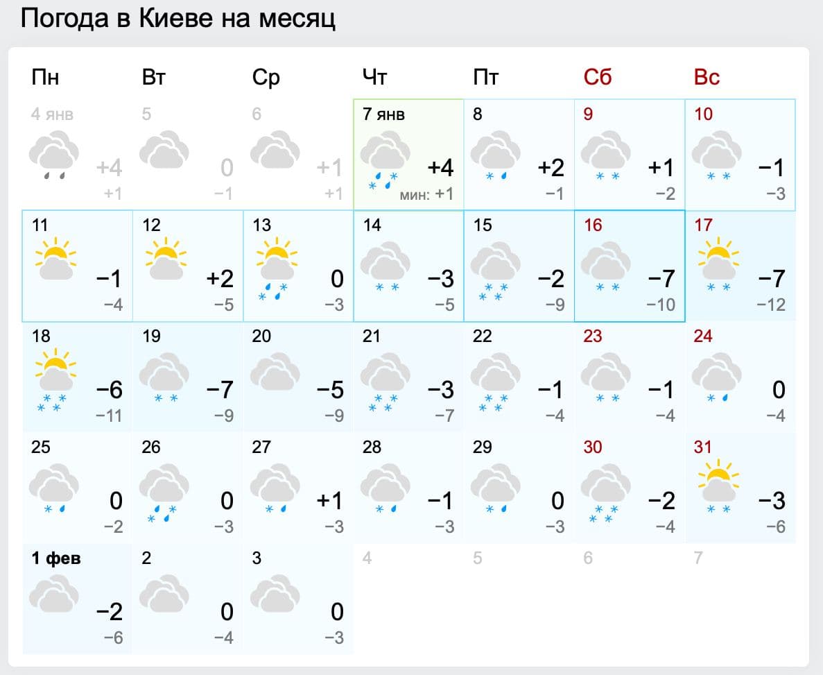 Похолодание в Киеве ожидается 16 и 17 января (суббота и воскресенье следующей недели). Температура воздуха ночью опустится до -12 градусов, а днем - до -7. Также в эти дни будет идти снег.