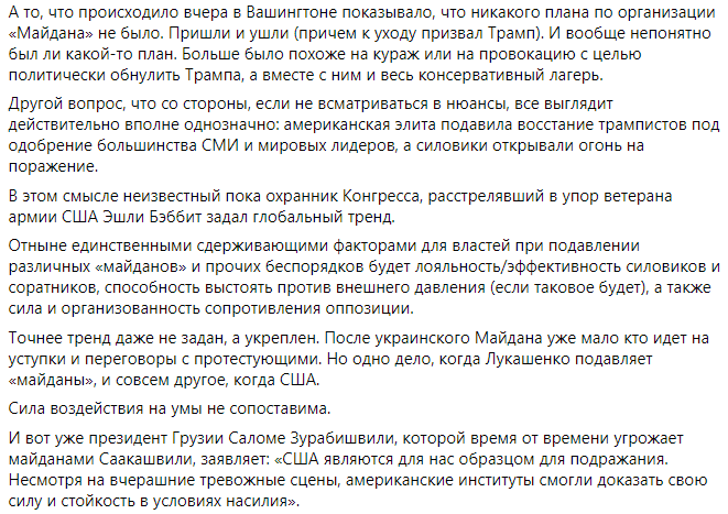 А то, что происходило вчера в Вашингтоне, показывало, что никакого плана по организации "Майдана" не было. Пришли и ушли (причем к уходу призвал Трамп). И вообще непонятно, был ли какой-то план. Больше было похоже на кураж или на провокацию с целью политически обнулить Трампа, а вместе с ним и весь консервативный лагерь.