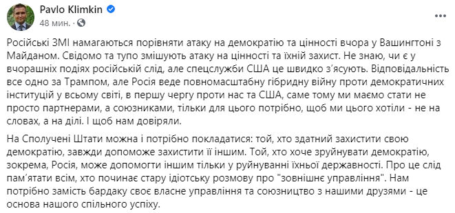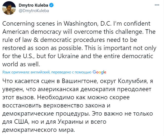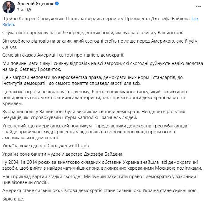 "Вчерашние события в Вашингтоне были вызовом мировой демократии. Недостойной является роль тех безумцев, которые спровоцировали штурм Капитолия и гибель людей. Уверен, что американский политикум – представители демократов и республиканцев – найдет правильные и мудрые решения в ответ на враждебные провокации против основ американской демократии.