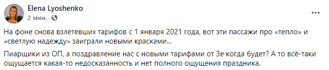 Пиарщики из ОП, а поздравление нас с новыми тарифами от Зе когда будет? А то все-таки ощущается какая-то недосказанность и нет полного ощущения праздника", – пишет адвокат Елена Лёшенко.