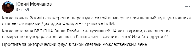 Когда ветерана ВВС США Эшли Бэббит, отслужившую 14 лет в армии, совершенно намеренно в упор расстреливают в Капитолии, – случится что? Или "это другое"?" – пишет обозреватель Юрий Молчанов.