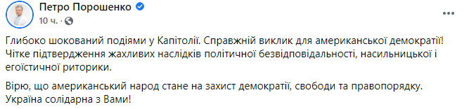 "Глубоко шокирован событиями в Капитолии. Настоящий вызов для американской демократии! Четкое подтверждение ужасных последствий политической безответственности, насильственной и эгоистической риторики. Верю, что американский народ встанет на защиту демократии, свободы и правопорядка. Украина солидарна с Вами!" – написал экс-президент.