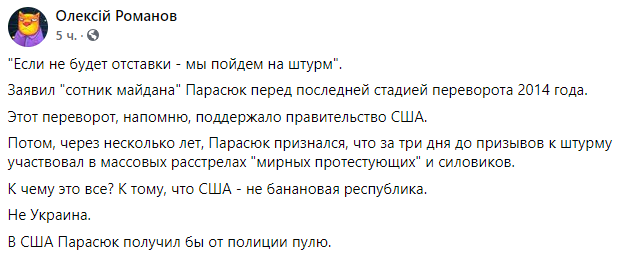 К чему это все? К тому, что США – не банановая республика. Не Украина. В США Парасюк получил бы от полиции пулю", – пишет журналист Алексей Романов.
