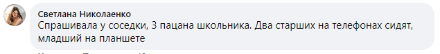 "Спрашивала у соседки, 3 пацана школьника. Два старших на телефонах сидят, младший на планшете", - рассказывает Светлана Николаенко.
