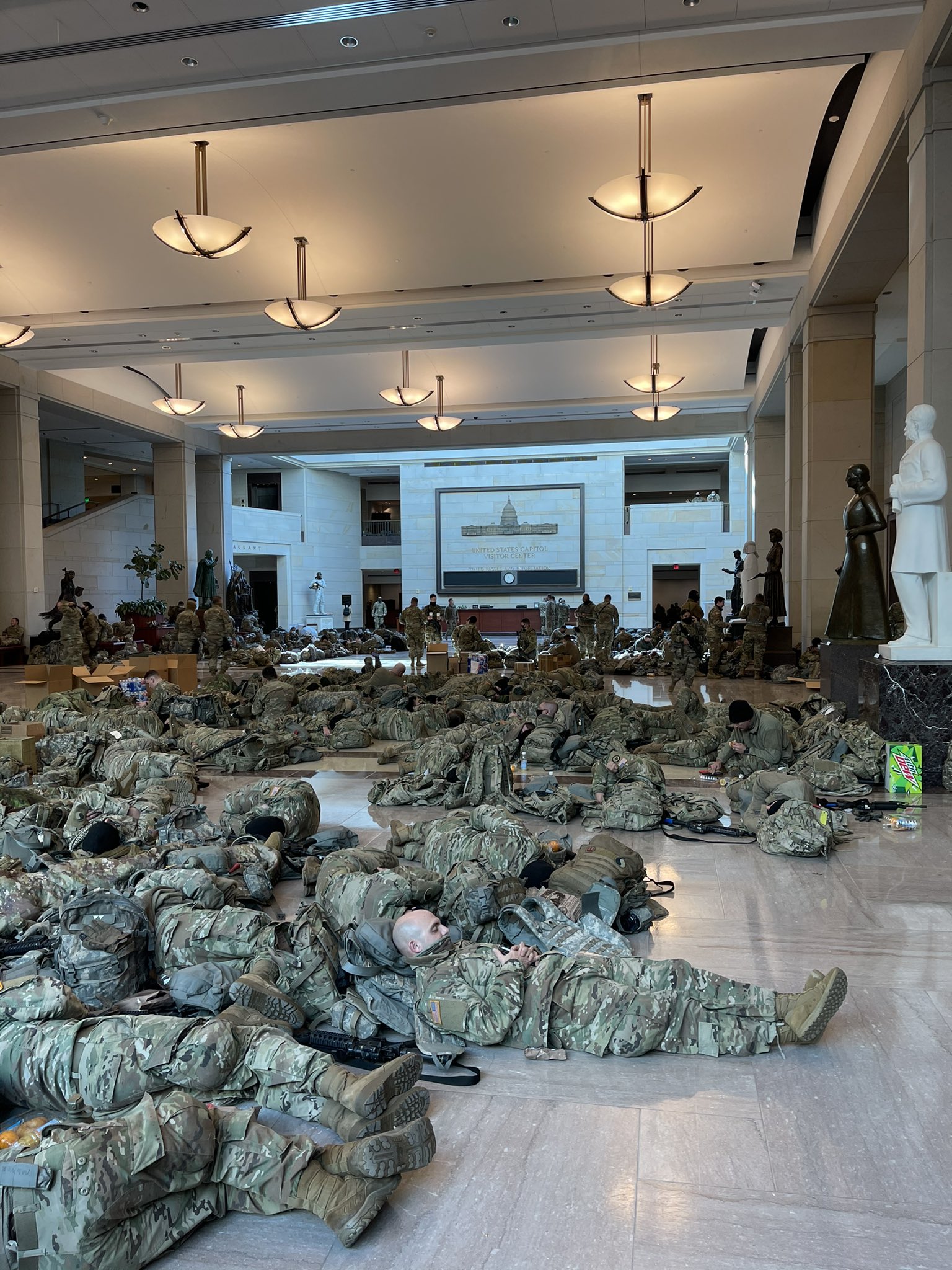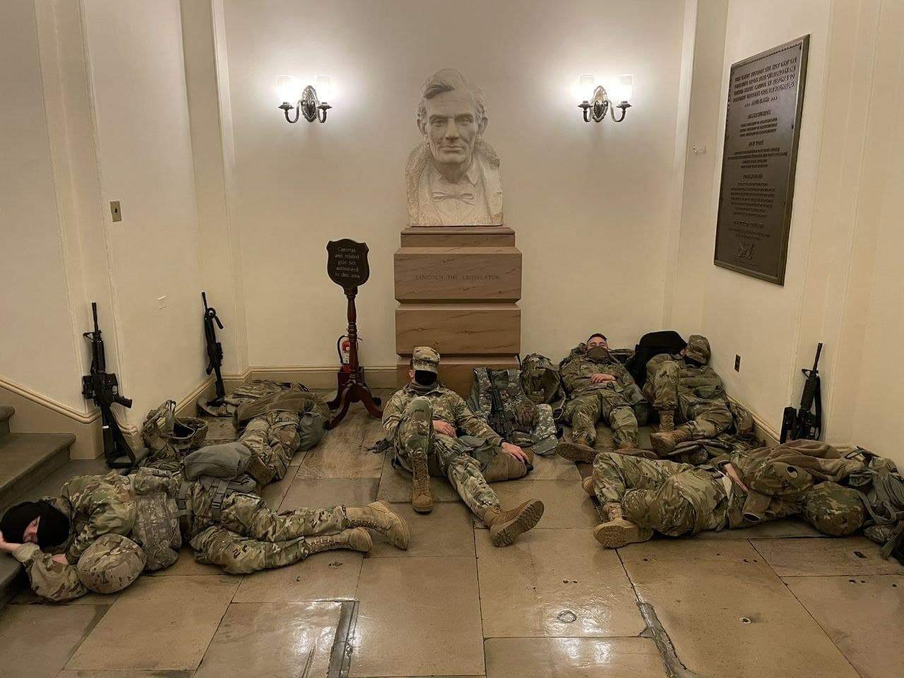Соцсети обошли фотографии десятков бойцов, спящих вповалку в коридорах Капитолия и в зале туристического центра, соединенного с ним.